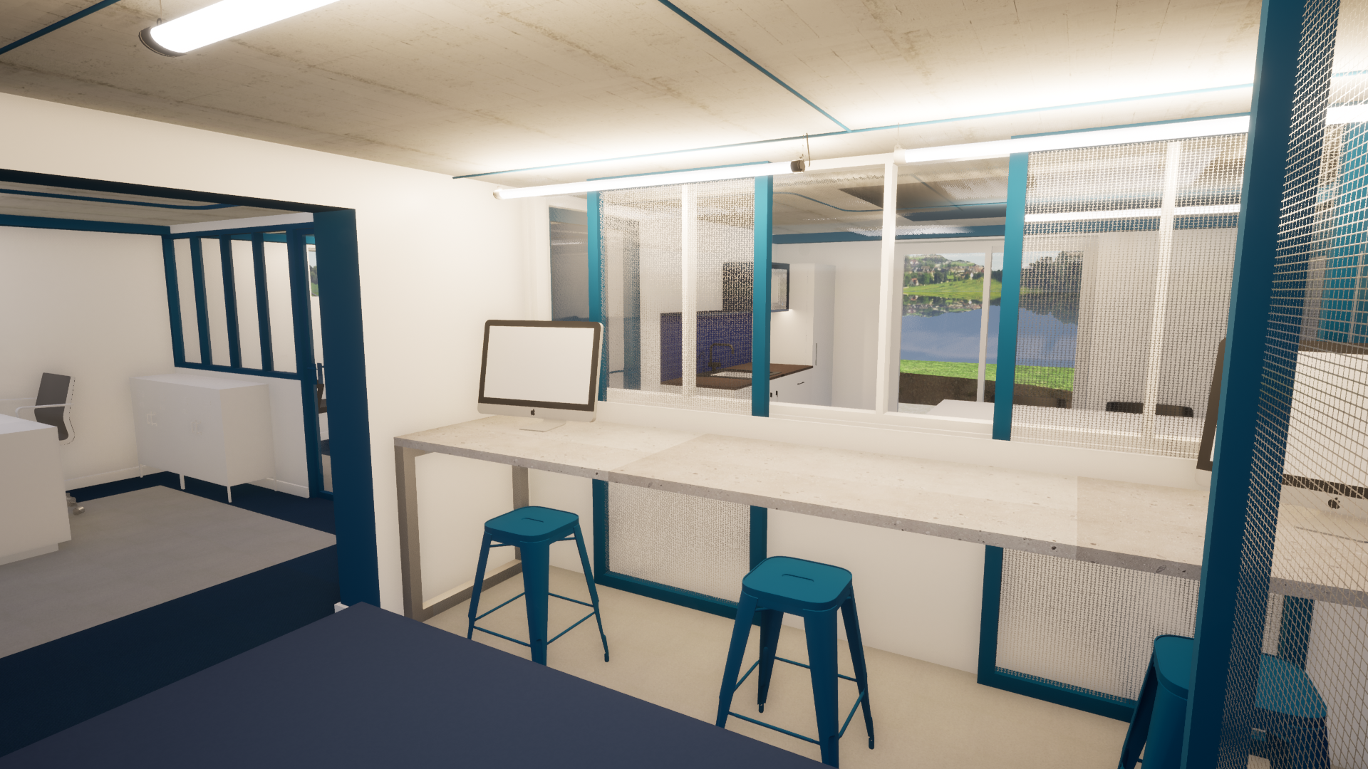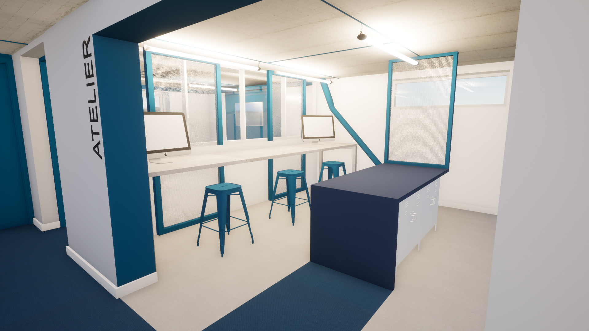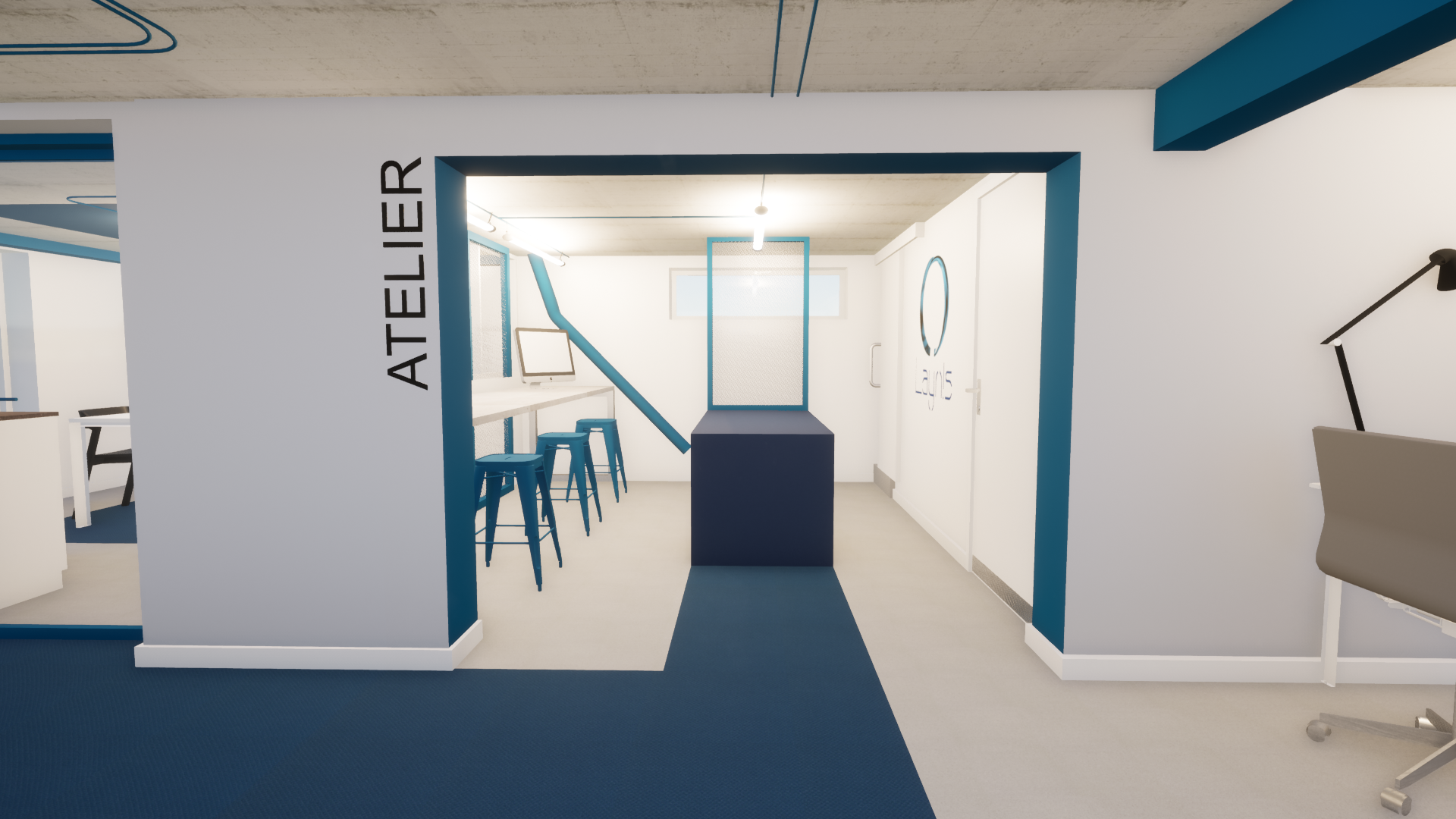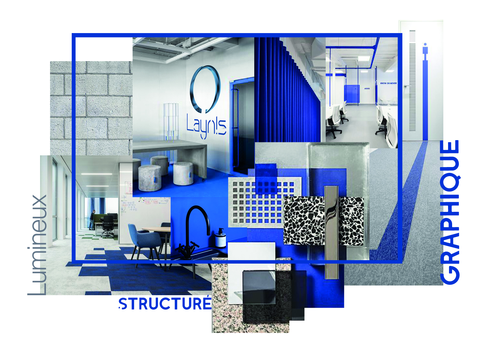Le principal défi de ce projet était une hauteur sous plafond réduite, rendant l’espace potentiellement étouffant. Nous avons répondu à cette contrainte par un jeu visuel de couleurs et de lumière pour agrandir la perception du volume. Par ailleurs, l’aspect technique et brut de l’espace a été mis en valeur pour lui donner une identité industrielle assumée, en cohérence avec l’univers de Laynis.