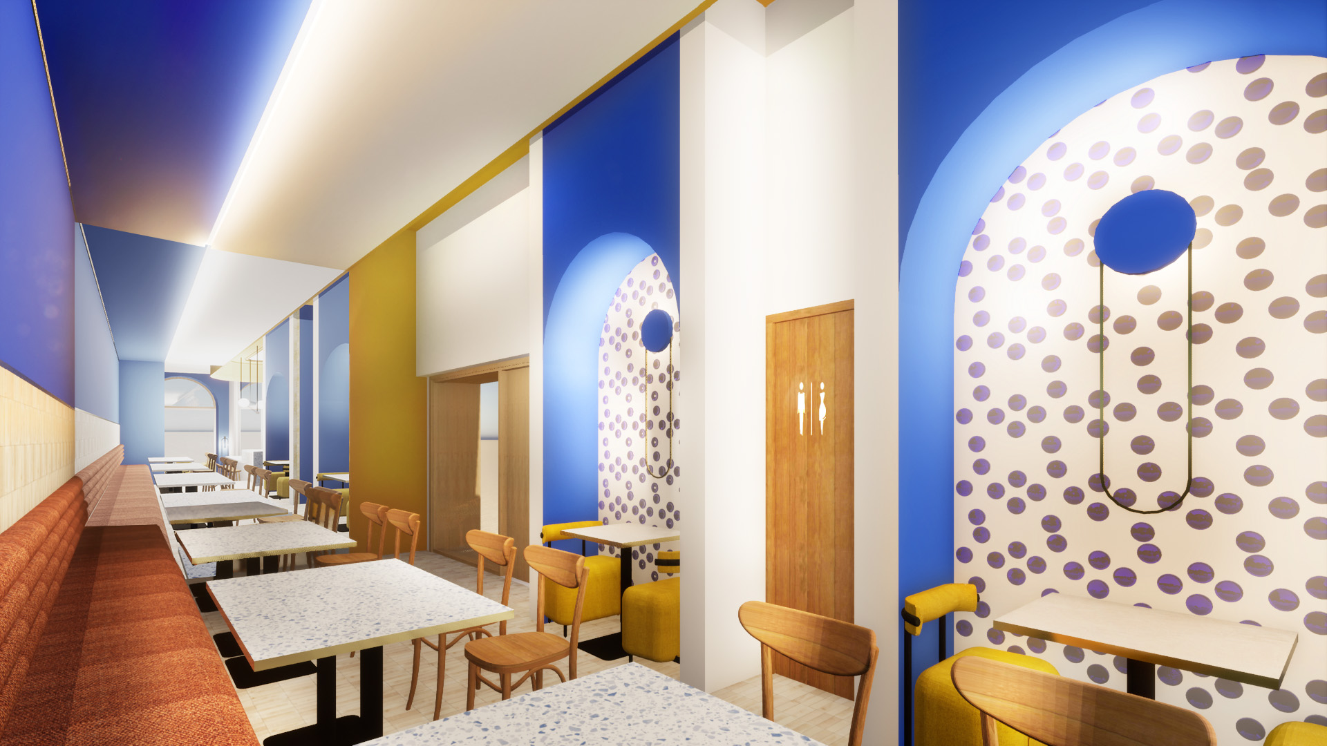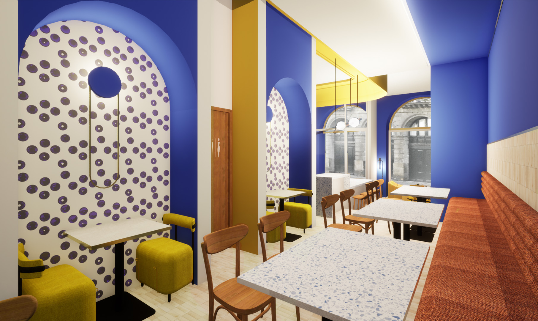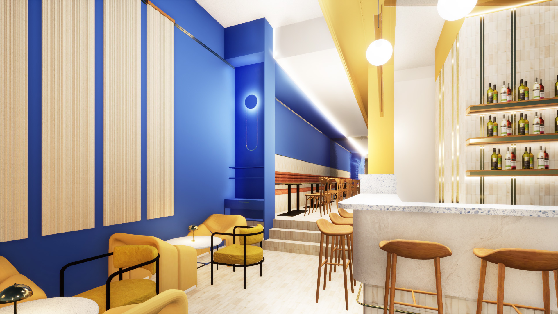 Le bar est la pièce centrale, servant de zone d’accueil, il distribue les différents espaces et typologies d’assises : allant du bar aux petits salons et de la table familiale aux banquettes traditionnelles des brasseries.