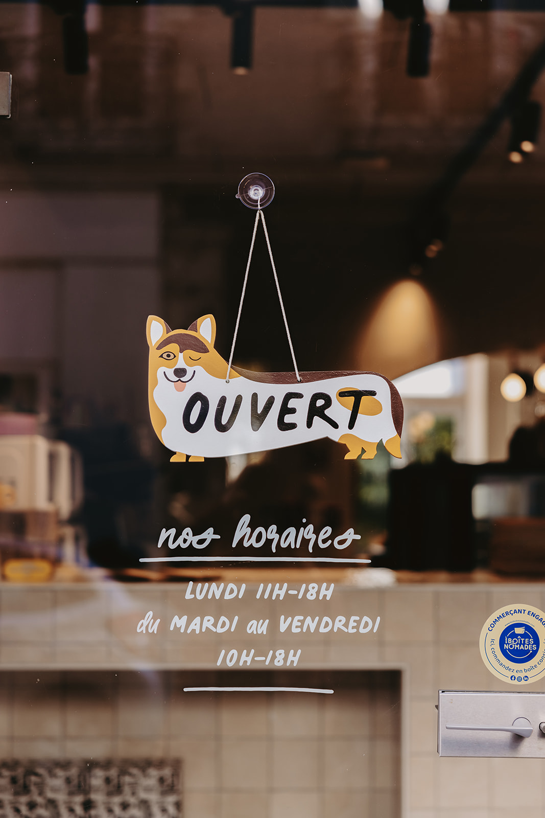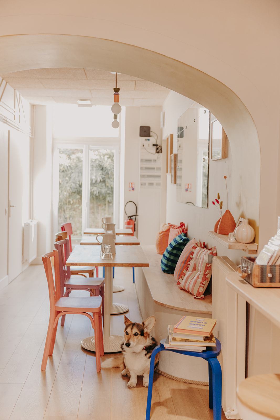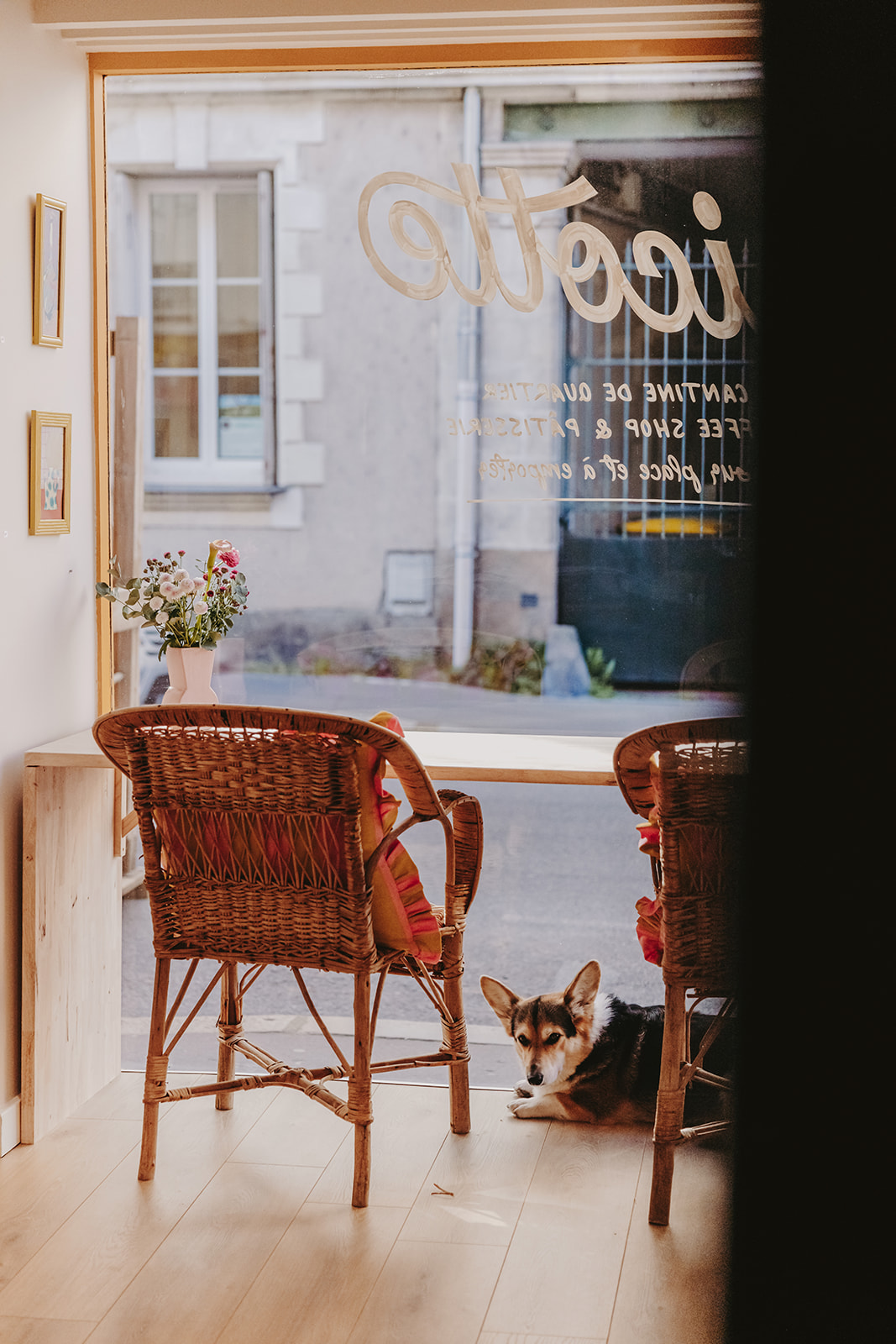 L’aménagement met en valeur de petits objets décoratifs soigneusement choisis et la présence de “Pompon”, la mascotte du salon, qui apporte caractère et singularité à cette adresse nantaise.